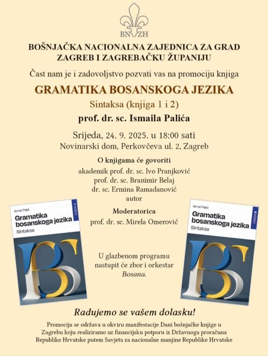 Bošnjačka nacionalna zajednica za Grad Zagreb i Zagrebačku županiju organiziraju promociju prvog i drugog toma knjige Gramatika bosanskoga jezika. Sintaksa, autora Ismaila Palića. Promocija se organizira u okviru manifestacije Dani bošnjačke knjige.