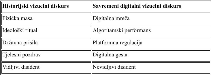 Savremeni digitalni vizuelni diskursi ne predstavljaju radikalni prekid s historijskim oblicima ideološke mobilizacije, već njihovu transformaciju. Konformizam se više ne nameće silom, već vidljivošću, a otpor se sve češće manifestira kroz tišinu i ne-učestvovanje. ■