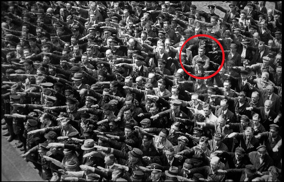 Fotografija prikazuje masovnu grupu muškaraca okupljenih na javnom prostoru, koji gotovo unisono izvode nacistički pozdrav (ispružena desna ruka). Većina prisutnih nosi radničku ili građansku odjeću, a dio njih i uniforme. U središtu pažnje nalazi se jedna osoba (označena crvenim krugom) koja ne učestvuje u kolektivnom gestu – ruke su mu spuštene ili prekrižene, a pogled i držanje tijela odstupaju od mase. Na denotativnom nivou, fotografija dokumentira: