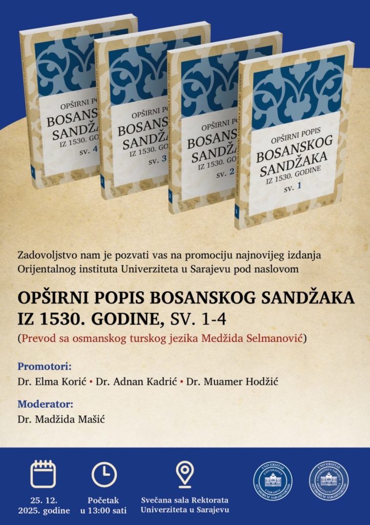 U okviru obilježavanja Svečanih decembarskih dana Univerziteta u Sarajevu Orijentalni institut Univerziteta u Sarajevu zaključuje obilježavanje značajnog jubileja – 75 godina kontinuiranog naučnoistraživačkog rada. Jubilej je tokom cijele godine obilježen nizom aktivnosti usmjerenih na publiciranje i promociju institutske izdavačke produkcije, kao i organizacijom međunarodnog naučnog skupa Kulturno-historijski tokovi u Bosni i Hercegovini V. Među najznačajnijim izdavačkim poduhvatima Instituta posebno mjesto zauzima kapitalno četverotomno izdanje Opširni popis Bosanskog sandžaka iz 1530. godine, koje je iz štampe izašlo u decembru 2025. godine. Ovo djelo objavljeno je gotovo dvije decenije nakon što je završeno i recenzirano kao naučni projekt Instituta. Riječ je o opsežnom istraživačkom radu na kojem je u periodu od 1996. do 2002. godine radila mr. Medžida Selmanović, prva magistrica arhivistike u SFRJ i dugogodišnja arhivistica Orijentalnog instituta Univerziteta u Sarajevu. Redakturu teksta prijevoda uradio je dr. Ahmed S. Aličić, dok su recenziju potpisali dr. Ahmed S. Aličić i dr. Behija Zlatar. Inicijativu za objavljivanje ovog izuzetno značajnog historijskog izvora, dvije decenije nakon završetka projekta, pokrenuo je dr. Adnan Kadrić, direktor Orijentalnog instituta u periodu 2014–2022. godine.