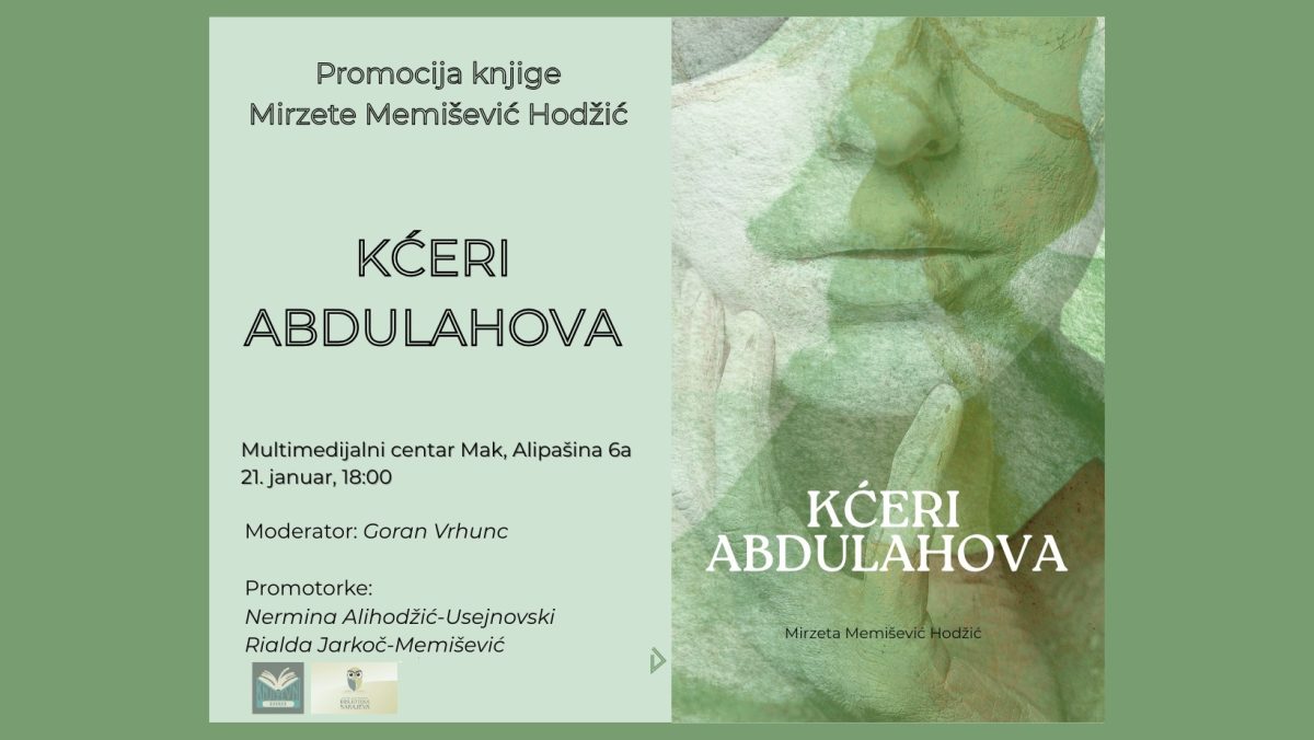 Književni korner organizira promociju knjige “Kćeri Abdulahova” autorice Mirzete Memišević Hodžić. Promocija će se održati u srijedu 21. januara 2026. godine s početkom u 18 sati u Multimedijalnom centru “Mak” (Alipašina 6a).